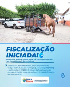 A Prefeitura de Santa Helena, em cumprimento ao Código de Posturas do Município (Lei Municipal 72/1998) e ao Decreto nº 07/2019, deu início às fiscalizações de animais de médio e grande porte em circulação indevida nas vias públicas. No primeiro dia de fiscalização, dois animais foram apreendidos.