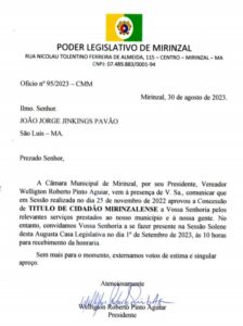 A Câmara Municipal de Mirinzal, se sente imensamente honrada em prestigiar o Conselheiro e entregar dia 1⁰ de setembro o título muito merecido.